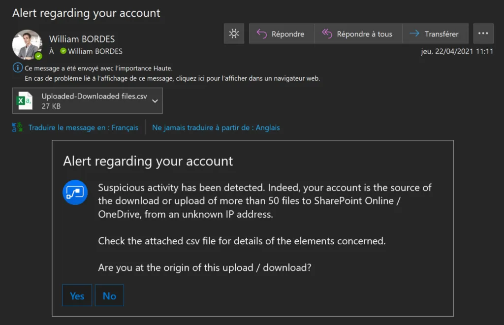 L’utilisateur reçoit un mail lui demandant si il est à l’origine de l’incident.