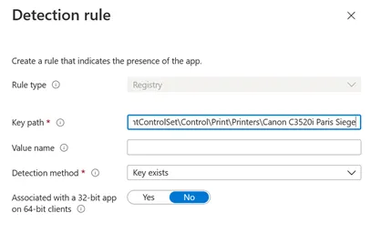 Dans notre exemple la méthode de détection s’appuie sur la présence d’une clé de registre liée à notre Imprimante