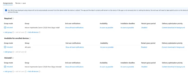 Il faut à présent gérer les Assignations. C’est-à-dire qui aura le droit d’installer l’application via son « Company Portal », qui verra l’application automatiquement installée sur sa machine en arrière-plan et qui se verra désinstaller l’application.