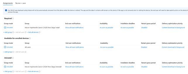 Il faut à présent gérer les Assignations. C’est-à-dire qui aura le droit d’installer l’application via son « Company Portal », qui verra l’application automatiquement installée sur sa machine en arrière-plan et qui se verra désinstaller l’application.