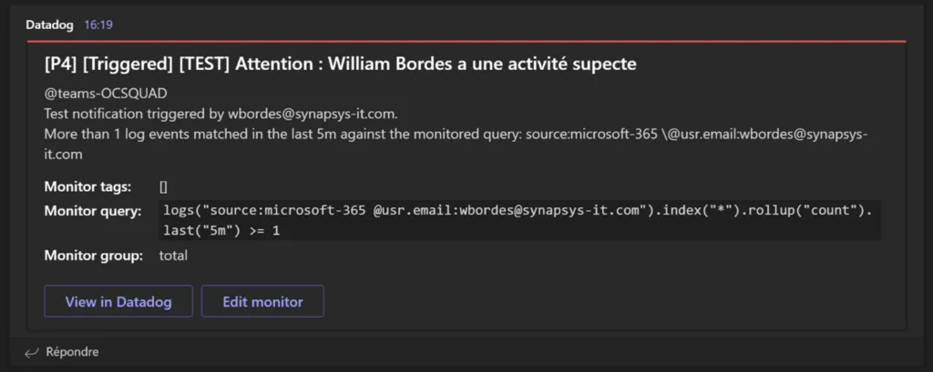 Beaucoup plus « brut ». Ils permettent une analyse plus approfondie de ce qu'il se passe sur nos tenants Microsoft 365. Très pratique pour investiguer, aller vérifier une information dans une multitude de logs manuellement n’est évidemment pas pratique du tout et très chronophage. Donc nous procédons à l’activité préférée dans notre cœur de métier : L’automatisation. Et dans DataDog, cela s’appelle un « Monitor ».