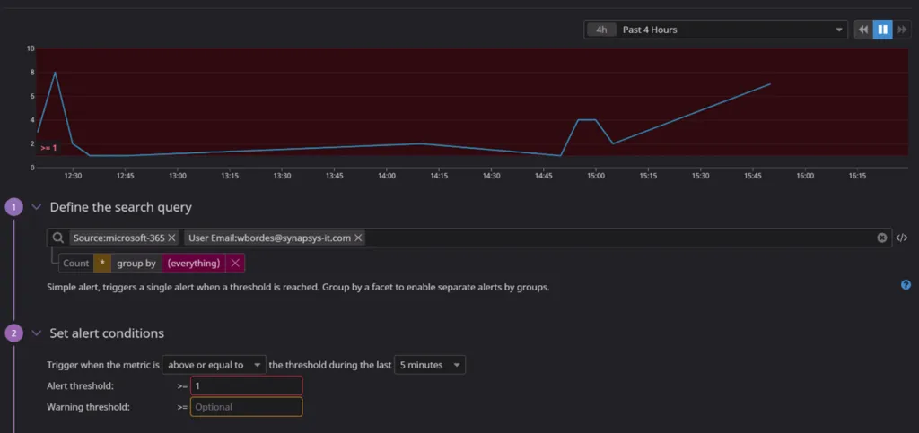 Dans cet exemple, je suis assez radical, je définis une alerte dès qu’une action de ma part est référencée dans les logs.