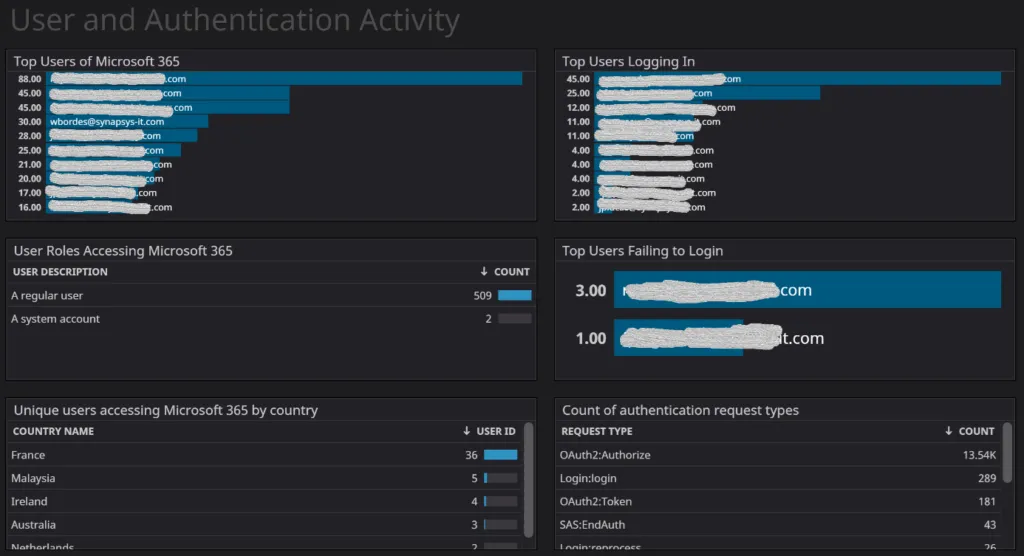 Ici, un exemple d’informations intéressantes et facilement visualisables comme les fichiers qui sont le plus lus, les pays depuis lesquels nos utilisateurs se connectent ou encore le nombre de tentative de connexion qui ont échouées (un trop grand nombre est souvent synonyme d’attaque brute force).